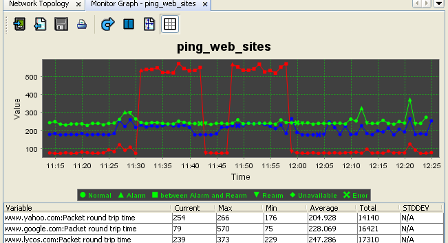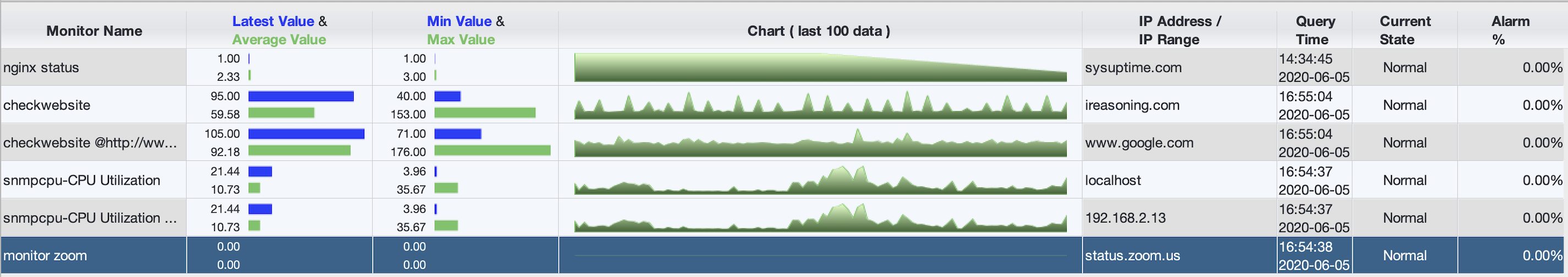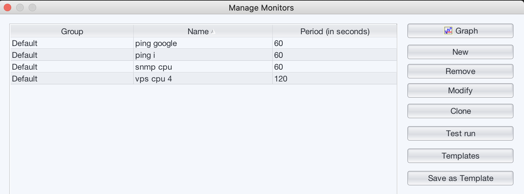 Monitors window displays an overview of status of monitors. You can apply filters so only a portion of monitors will be displayed. The monitor table can be exported to an image by using the “Tools/Export to Image” menu.