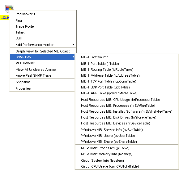Right click on a node, depending on whether it is SNMP enabled, the following popup menu will show up: