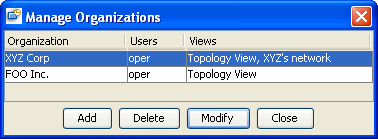 An organization can have one or more users, and it can be associated with one or more network views. A user can only open the views assigned to his organization.