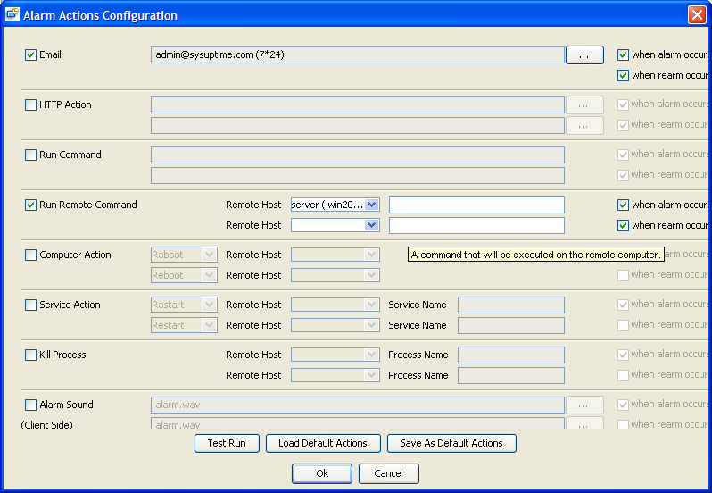 | Run Command (Client Side) | Execute a command on the client side when receiving this event. The SysUpTime client must be running and connected to the server. |