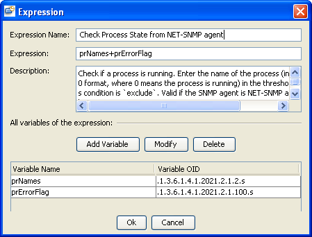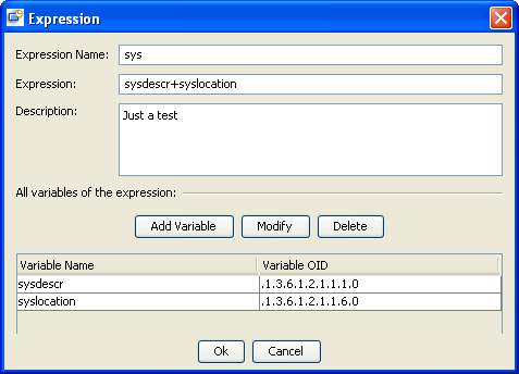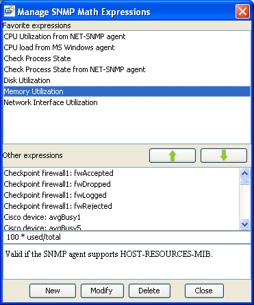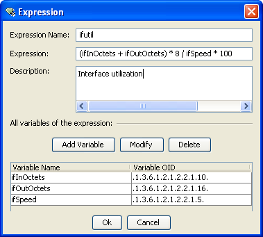 There are some math expressions being used in SNMP monitors. You can create new expressions or edit existing ones. If an expression contains tabular objects, you need to provide index suffix for it, and then a new expression with the index suffix appended to its name will be added automatically. For example, if you use ifutil expression, and then you choose index to be “.2”, then a new expression named “ifutil.2” will be created automatically.