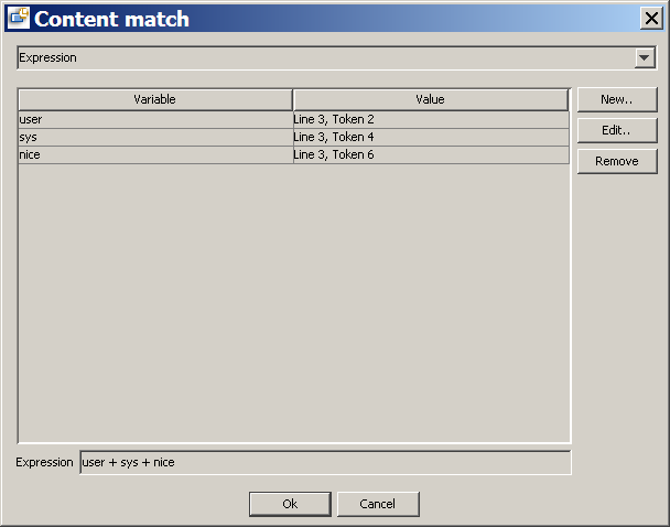 Sometimes, we need to use a math expression to calculate the final value of some data. For instance, one way to calculate user CPU usage on Linux is to issue this command “top -n 1 | head -3”. The following is a sample output:top - 15:20:13 up 7:17, 21 users, load average: 0.51, 0.41, 0.47 Tasks: 208 total, 1 running, 207 sleeping, 0 stopped, 0 zombie Cpu(s): 7.8% us, 1.8% sy, 0.1% ni, 89.4% id, 0.7% wa, 0.0% hi, 0.3% siThe CPU usage is 7.8 + 1.8 + 0.1 = 9.7, which is based on the values of the second, fourth and sixth tokens on the third line. This screen shows an expression that calculates the result of “user + sys + nice”: