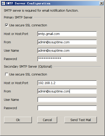 Two SMTP servers can be configured. If the primary server fails, the secondary server will be used for sending emails. If only primary server is configured, then emails cannot be sent if it fails.