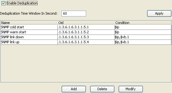 Here is an example. In the above figure, the time window is 60 seconds. For the SNMP cold start trap, if trap sender’s IP addresses are the same, then it is considered to be duplicate alarms. For instance, if an SNMP cold start trap is received at 10:00:00 AM sent from 172.16.1.90, then any new cold start traps from 172.16.1.90 received before 10:01:00 will be discarded. However, if a new cold start trap from 172.16.1.90 received at 10:01:01, it is not regarded as a duplicate trap.