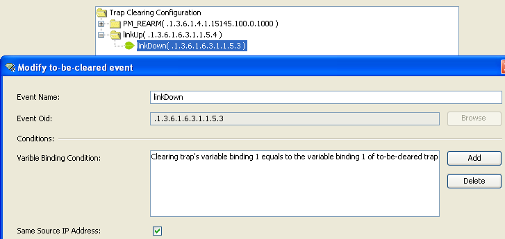 Here is an example. In the above figure, it defines a linkDown trap can be cleared by a linkUp trap when the following conditions are satisfied: