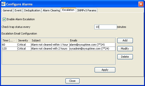 If an alarm whose severity is critical, and it is not cleared for one hour, then an escalation email will be sent to alarm@sysuptime.com. It the alarm is not cleared for two hours, an escalation email will be sent to sysadmin@sysuptime.com. You can send escalation email to different email accounts based on time.
